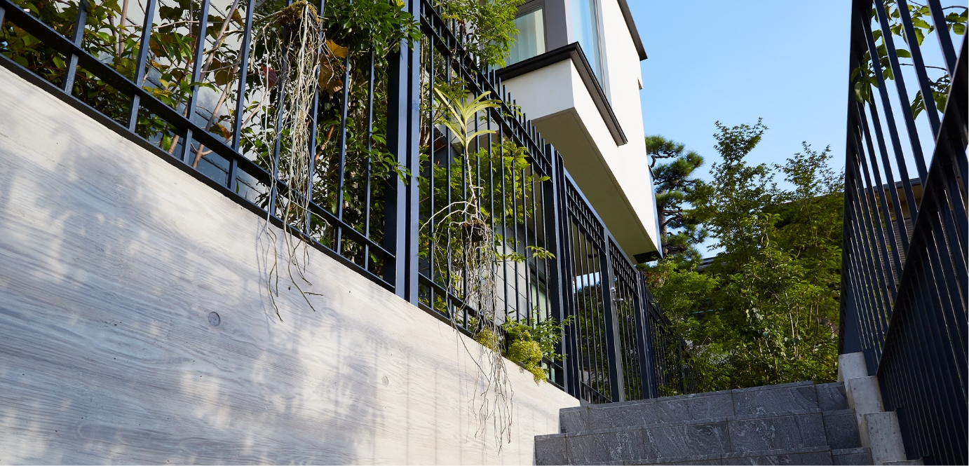 - お越しいただいた方にリラックスした状態で気持ちを切り替えていただけるよう、木々や植物に囲まれた、落ち着きのあるアプローチでお迎えいたします。